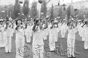 办学目标:为学生终身发展奠基,培养“崇尚运动,热爱读书,志存高远,知行合一”的人才。 |  | 一小的学生表演诗文韵律操。(资料图) |
