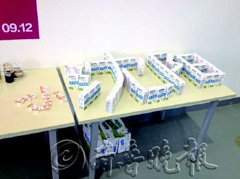 媒体餐厅里,志愿者用盒装牛奶摆出了“沈阳”的造型,没想到,某位记者在前面摆了个“小”。