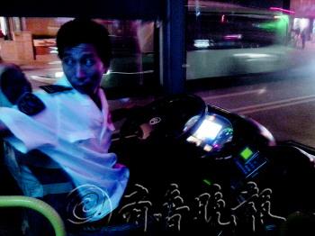 11日晚9时许,许振军仍在49路公交线上跑车。  本报记者 尉伟 摄
