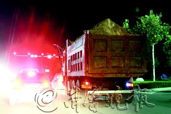 10日晚上9:40,在潍坊市东风街月河路附近一辆拉渣土的大货车正在通行,车辆的后背上并没有按要求写放大号牌。     本报记者 孙国祥 摄.
