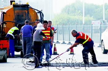 为创城验收做准备,市区从4月份就开始补修损坏的路面。图为9月11日,市政工作人员在新河东路上抓紧抢修损坏的路面。                        本报记者 王小会 摄