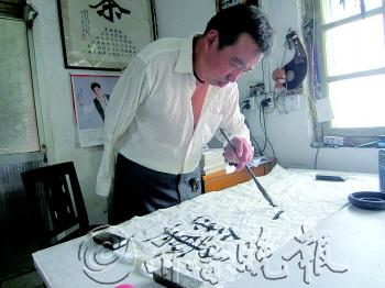 文/片 本报记者 周千清 “老年活动中心的话筒,你帮忙找找吧。”、“咱社区纪录片的光碟,你看一看怎么发。”……菏泽开发区丹阳办事处庞楼社区的居民,有事都好找庞德强咨询帮忙。如同庞德强的为人受社区居民欢迎一样,他练得一手好字更让人称赞。意外失去右臂之后,生活上甚至都无法顺手的他,却用左手练出了一手好字,庞德强用这句话为自己总结:“要干的事,就一定做好。” “字如其人,字好人也好” “就是他用左手写得一手好字,从这个路口拐过去就能看到他家了。”一位居民热心地给记者指路。10日,记者很快找到了庞德强的家 早上八点钟,社区工作人员就来到庞德强家,把记录庞楼社区发展变迁及历史文化的碟片交庞德强整理。 “我平时还帮忙看管社区老年人活动中心。”庞德强说。失去右臂的生活乐观而积极。 “字如其人,都好!我们社区的宣传标语,都是他写。”庞楼社区办事员庞层红说,庞德强不仅人品好,还是社区的“笔杆子”。 “要干就干好,左手练出好字” 1996年,27岁的庞德强帮人安装窗户,却发生意外。他的右臂大动脉被割破,由于右小臂供血不足坏死,只能截肢。 起初,截肢带来的不便以及生活环境的变化,让庞德强焦躁不安,但是他没有自暴自弃。 2000年的一天,庞德强和社区几位老年人聊天,老年人一句有心无心的话,让他记在了心里。“每十年我们写家谱,老人们说我可以练字,正好四年后可以写家谱。” 庞德强遂下决心练字,但是左手练字谈何容易?“起初就是‘推’字,而且看不到比划,之后我描了一年,临了一年。”庞德强说,支撑他的是自己的信念,“只要想干就能干成。” 练字三年后,庞德强摸索出窍门。最终,庞德强左手写出的毛笔字得到了全社区人的认可,“算不上多好,就是帮着社区和居民们写写东西。”庞德强谦虚地说。 如今,庞德强在朋友的工地上班,帮着记账。尽管大部分时间上班,但他把写字的东西也带到了工地,“每天都练习,已经放不下了。”庞德强说。