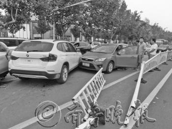 | 11日下午5点50分左右,在东昌路与柳园路交叉路口,一辆白色宝马车撞毁护栏后又连撞两车。 本报记者 孟凡萧 摄 |