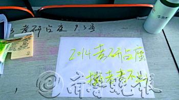 我是一名大四学生,面临毕业,我选择了考研。眼下距离考研还有三个多月,为了方便同学们考研复习,早在考研报名前我们学校就开放了专门的考研自习室。但是由于考研人数多而自习室座位少,学习氛围浓、环境安静的好座位都要被抢“疯了”。能在为数不多的考研教室里有个座位,会让很多同学非常羡慕的。所以为了保住自己的“宝座”,同学们都绞尽脑汁想出了很多办法,“占座文化”比比皆是。很多座位上贴着类似“2014考研占座”、“重占拼命”、“私人领地,禁止侵占”、“请勿复占”等提示语,有的同学还将水杯、坐垫、饭盒甚至暖瓶等生活用品放在座位上占座,五花八门的占座方式让人忍俊不禁的同时也倍感无奈。 作为准备考研的我也在自习室里占了座位,为了保住这个难得的座位,我每天坚持早到晚归,并在休息之余拿起相机记录下了同学们疯狂占座的一幕幕。 (拍客奖400元)
