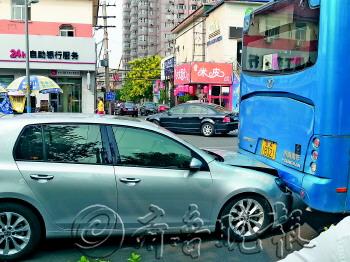 本报96706热线消息(见习记者 李师胜) 9月14日下午2时许,在山师北门东侧,因后面的一辆18路公交车刹车不及时,一辆高尔夫轿车车头差点被撞入前方一辆18路公交车底。 9月14日下午2时许,王先生开着一辆高尔夫轿车跟在一辆18路公交车后,因前方堵车,两辆车先后停车。跟在后方的一辆18路公交车刹车不及时,撞在了轿车上,轿车随后撞向了前方18路公交车,轿车车头差点钻入了前方公交车车底。 “我都已经停车了,后面的公交司机根本就没有刹车,突然撞在我车的后面,吓得孩子哭得厉害,岳父岳母也受伤了。”轿车车主王先生说。 记者在现场看到,轿车的车头前方已被挤扁,后侧则整个凹了进去,后面的公交车前方的车牌也被撞得变形严重。“我的头被撞起了一个大包,十七八万的车也被撞得不成样子了,幸亏孩子没事。”站在路边的王先生的岳母一边用手捂着后脑位置,一边用颤抖的声音跟记者说。 肇事的后面的18路公交车司机则低头站在路边,连续抽着烟一声不吭,前方的18路公交司机前来安慰。 随后公交主管人员、保险公司人员与交警前来协调处理。经交警人员认定,后面的公交司机负全责。
