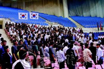 | 14日,朝鲜平壤,2013亚洲杯暨亚洲俱乐部举重锦标赛举行,韩国举重选手获得金牌,在朝鲜首次奏响韩国国歌、升起韩国国旗。 东方IC供图 |