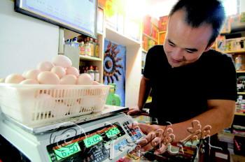 | 15日,一店主正在为顾客称鸡蛋。本报记者 邓兴宇 摄 |