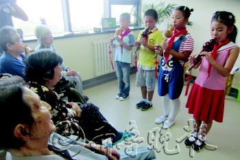 15日,在青岛市福山老年公寓活动室里,八大峡小学几名学生正在表演葫芦丝演奏。中秋佳节临近,八大峡小学学生联合人人公益,给敬老院的老人们表演节目、赠送自己画的画。除了葫芦丝演奏,还有二胡、舞蹈、唱歌、诗朗诵等表演。