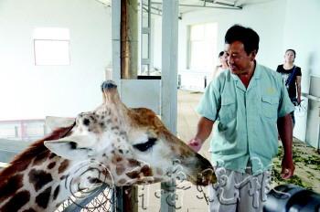 | 青岛森林野生动物世界饲养员李开奎专门去济南看望长颈鹿“长青” | |