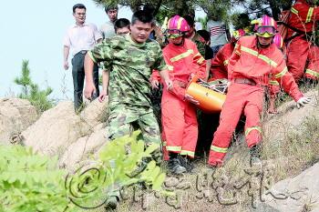 担架绑着伤者 一步步往山下挪动 15日下午1点40分,热心读者周先生拨打本报热线8308110称,有人在攀登山海天旅游度假区庙山的时候发生骨折。 随后记者赶往现场,由于此处比较偏僻,车辆只能沿着崎岖的山路往上走,速度非常慢,而且车辆只能行驶到半山腰附近,往上已经没有上山的路。记者找到现场后发现,120急救车、武警、消防、公安等都已经在开展救援。 据周围村民介绍,庙山海拔200余米,要把伤者抬下来,垂直距离应该有一百余米,但山上并没有路,而且到处都是杂草乱石,救援人员想往下走并不容易。 记者看到,救援人员将伤者固定在担架上,伤者是个男生,头部被衣服遮盖着,时不时传出伤者的呻吟声,伤者后面还跟着十多位学生模样的人,据了解那些都是伤者的同学。 救援人员抬着伤者,还要走一步试探一步,慢慢往山下挪,每一步走得都比较难。 救援人员搭人梯 传递担架下山 往下走了一段时间后,山路越发难走,到处都是石头、松树以及草丛,救援人员怕对伤员造成伤害,不得不再次放慢脚步。 为尽量走得平稳,官兵们站成两排搭成人梯,把担架拖在手里一点点往下传递,包括一些热心市民也加入到救援队伍中。有些官兵的手以及腿都被树枝划破。 2点20分,受伤学生终于被传递到救护车前,很快,伤者被送往医院。 参与救援武警 刚给学生军训完 据现场救援的日照市武警直属一中队队长卜斌介绍,15日中午12点30分左右,有个学生跑到他们驻地说有个同学在山上骨折了,请求帮助。 “当时我们正在吃饭,马上发下碗筷,我们6个官兵就跟着学生来到山上。”卜斌说。 上山后卜斌发现受伤学生一直在呻吟,担心处理不当伤者会二次受伤,卜斌马上联系了医生,“医生告诉我们,尽量不要挪动伤者,然后用凉水擦一下伤者的脸,不要让伤者昏迷了。”按照医生的说法,卜斌他们马上开始施救。 不一会,消防、公安、医生以及伤者的同学都赶到现场,医生诊断后,发现伤者胳膊和大腿都受伤,武警张永蕾随后就脱下衣服当做绷带把伤者的胳膊固定住,然后用树枝等将伤者的腿固定住。 “这些学生我们刚给军训完,都还认识。”卜斌说,他们中队刚刚给这批大一新生军训完。随后记者了解到,该学生左大腿骨折,右臂也有些轻微骨折,正在接受治疗。 伤者是大一新生 下山时摔倒骨折 据了解,该伤者为山东外国语学院大一新生,刚军训完不长时间,当天上午他们5个同学一起去爬庙山,爬到一半时又遇到一女生,随后六个人一起往山上爬。11点30分左右从山顶往下走的时候,伤者扶着石头往下走,不小心摔倒在石头上,大腿就骨折了。 附近一些村民介绍,经常会有一些市民前来爬庙山,但庙山并不是开发的旅游景点,没有路可走,只能摸索着往上走,“山上全是石头和草丛,稍不注意就容易出事。”一村民说。 (请周先生前来领取80元线索费) 9月15日上午,山东外国语学院6名大一新生去爬山海天旅游度假区的庙山,一名男学生不慎从石头山摔下来导致大腿骨折,武警、消防、公安以及市民等搭起人梯,将学生从山上抬下来。