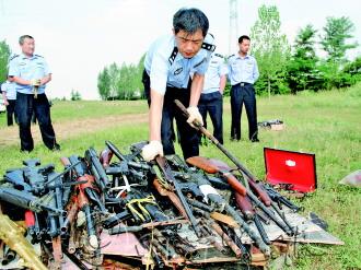 13日早,威海市公安局治安支队民警在经区一靶场举行了销枪活动,各式制式步枪、手枪,自制猎枪共47支及大量仿真枪被一举焚毁。 本报记者 吕修全 摄影报道