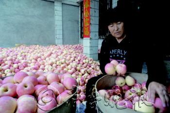 | 苹果上市,收购商严格把关,分拣苹果。 本报记者 李娜 摄 |