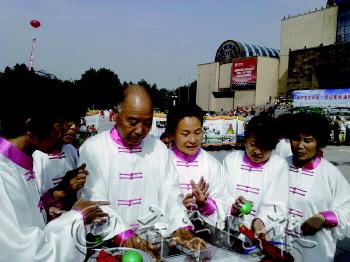 13日,淄博市暨张店区2013科普日启动仪式在市博物馆广场举行。市民纷纷涌向市科技馆推出的50件科普展品,现场体验。图为一位市民将双手放在两块不同材质的金属板上,观察自己身体产生的微电流。