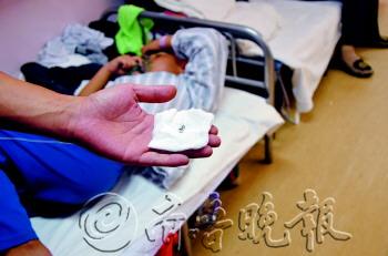 本报9月17日讯(见习记者 许亚薇 戚云雷) 16日晚上8点多,8岁的从帅正在章丘的家里看着电视剪指甲,一个不注意,指甲刀上的卡子突然弹出,飞到他嘴里,卡在了喉咙上。在送医时又掉入右肺部,经过医院紧急手术,异物终于被取出,从帅脱离了危险。 17日下午3点,省立医院西院耳鼻喉科病房走廊上,一晚上都没合眼的高先生坐在病床边,显得非常疲惫。从全身麻醉中刚刚苏醒的小从帅还躺在病床上,戴着氧气罩。 “手术完7个小时以后才能吃饭,这会儿肯定挺饿。”高先生看着病床上的儿子说。 高先生回忆,16日晚上8点多,正在楼下广场上纳凉的他突然接到妻子的电话,得知儿子喉咙里卡了东西。他赶紧回到家中,带着孩子开车往章丘市里的医院跑,但医生称市里的医院条件有限,他只好驱车匆忙赶往济南市区。 “来济南的路上,由于孩子喉咙卡了指甲刀的卡子,不停地咳嗽,嘴里还不停地流口水。”孩子父亲描述着16日晚上的情景,依然心有余悸。 高先生晚上9时30分左右带着小从帅顺利到达省立医院。查看过病情后,急诊医生建议孩子转到省立医院西院,那里有专业的耳鼻喉科。同时,接诊医生也再三嘱咐高先生,“一定不要让孩子睡着”。 晚上10点左右,孩子到达省立医院西院。由于高先生和小从帅往科室走时挺着急,卡在喉咙里的异物顺着气管滑落到右肺部。 “医生和我说,幸亏是滑落到右肺部,还不影响呼吸,要是卡在中间,后果不堪设想。”高先生说道。 17上午10点左右,医生将小从帅全身麻醉后,从他嘴里插入医疗用管,经过手术后终于将指甲刀卡子取出。