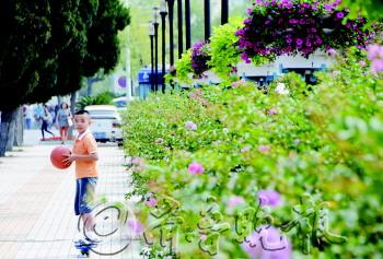 | 在世纪广场前的道路上,儿童在玩滑板,身旁的绿树红花增添了别样风景。 本报记者 马志勇 摄 |