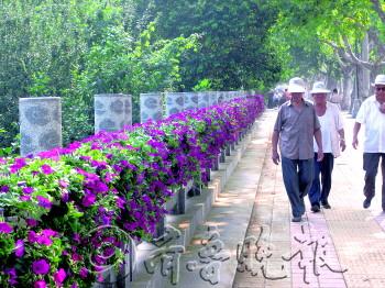 9月17日上午,记者在位于中华路上的中华桥上看到,桥的栏杆上被“种植”上艳丽的鲜花,引来不少市民驻足观看。记者从城管局了解到,中秋、国庆临近,为点缀节日气氛,迎接即将到来的林交会和创建国家园林城市,该局对市区主要路段进行了立体绿化。