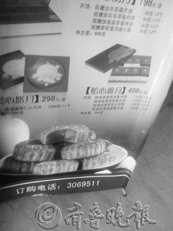高价月饼酒店在售 位于黄河五路新立河东路的滨州市大学饭店内,一张月饼海报赫然立在饭店大厅里,上面罗列着几种月饼简介,每盒价格从198元到498元不等。月饼销售处工作人员介绍,中秋临近,几种月饼销售都比较快,除78元和198元的月饼有现货,其余几款高价月饼都没有现货了,如果想买可以向厂家订货,急用的话还可以从其他地方调货。 海报资料显示,价格为198元和498元的月饼均为每盒八个,其中198元的月饼为低糖茶味,每个口味两个,净重400克,即不到一斤。498元的怡心雅月系列月饼都是燕窝加其它常用馅,每种口味两个,净重880克。而298元的赏心悠月系列月饼,一盒仅一个月饼,重1000克。