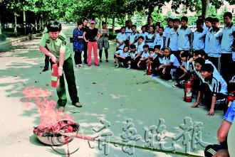 本报9月17日讯(记者 吕修全) 13日上午,城里中学全校2700名师生参加了火灾疏散演练,共同上了新学期消防安全第一课。之后该校1995级学生、现环翠消防大队参谋王丽芳给初一年级共700多名新生讲授了火灾自救等知识。 “全体师生请注意!我校一教学楼三楼起火,请大家迅速撤离教学楼!”13日上午10点课间时间,城里中学突然响起急促的警报声,值班老师随即通过广播通报了校内“火情”。各班级刚刚下课的老师们迅速组织各班同学有序撤离教室。 一队队学生使用毛巾、手帕或袖口捂住口鼻,弯腰跑出教学楼,找到自己班级的应急集合地点列队站好。期间,有学生嬉笑玩闹,但看到其他同学非常认真地参与火灾疏散演练,小淘气们也认真了起来。3分钟后,该校全体2700名师生,均安全撤离教学楼,分列两处站好。 火灾疏散演练结束后,各班级学生安全代表及无课老师们纷纷聚到该校运动场南侧道路,此时那里已燃起两桶熊熊大火来。环翠消防大队参谋王丽芳拎起一瓶灭火器,向师生们讲解了干粉灭火器的使用方法。师生代表们先后使用灭火器扑灭桶内明火。学生小亮感觉灭火器操作简单易学,操练后兴奋地说:“终于有机会用用灭火器了!” 在全体700余名初一新同学的火灾自救知识讲座上,王丽芳透露其实她是城里中学1995级学生,“说起来你们还得叫我大师姐呢!”此话一出,迅速拉近了她和学生们间的距离。王丽芳以发生在威海的一些真实火灾案例,向师生们讲授了火灾中自救及逃生的常识、知识。“作为新生,入校后迅速熟悉学校环境,知晓逃生通道方位,是学弟学妹们应该立即掌握的。” 据城里中学老师介绍,该校不定期地举行火灾、地震及防空疏散演练,已形成常态化机制。