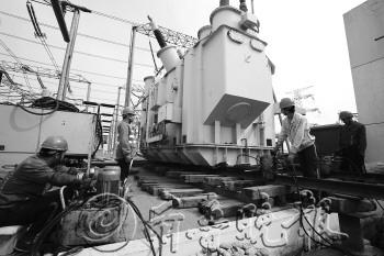 16日,国网山东电力对500千伏聊城变电站进行扩建增容,成功整体平移了一台吨位约600吨的75万千伏安变压器,其容量、吨位、距离均为国内主变压器通过“陆运短倒”方式整体平移的第一。图为施工人员正在平移2号主变压器本体。