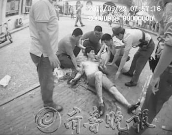 本报9月22日讯(记者 刘腾腾 通讯员 栾云海) 22日一早,在城阳康城路上,一名精神失常的男子突然打碎路边一家店的玻璃,用碎玻璃割伤自己的手腕,顿时鲜血直流。民警强行上前为男子包扎伤口,并拨打了120。经抢救,男子已脱离生命危险。 22日早上7点半,城阳公安分局正阳路派出所接到指挥中心指令称,在正阳路与中城路路口,有一名男子疑似精神失常,抓住一辆清洁车不放,嘴里还骂骂咧咧。接警后,正阳路派出所民警迅速赶往现场。 赶到现场后,民警找到正双手抓住清洁车车厢上的铁杆不放的男子,向清洁车上的工作人员了解情况后,民警上前劝说男子不要妨碍他人工作,可是男子似乎并不听劝,对民警也是进行辱骂。男子说的话前言不搭后语,因此民警猜测男子极有可能是精神失常。正当民警上前准备将男子拉下来时,男子突然尖叫并挣脱了民警,跑到十字路口中间。此时正是上班高峰时期,车辆来回穿行很是危险,为了避免男子乱跑伤到自己或他人,民警只好将男子包围起来,然后慢慢将他逼到路边。 就在民警想趁机出手将男子制服时,男子却突然迈开大步向康城路跑去,跑到一家洗衣店门口停下脚步,然后突然出拳将门口的玻璃打碎,之后的一幕更是吓了民警一跳,只见男子随手拿起一块碎玻璃向自己的手腕处划了下去,顿时鲜血直流,男子不顾疼痛随后继续向前奔跑。人命关天,民警迅速追赶,在追了近100米后几名民警终于合力将男子制服,然后到附近药房买来纱布绑住男子血肉模糊的伤口,并拨打120急救电话。 医生检查发现男子伤口较深,已经伤及血管、神经,经医院抢救,男子已经脱离生命危险,但还需继续住院治疗。目前,民警已经联系到男子在青岛的亲属,得知男子姓李,至于为什么突然精神失常,其家人也不知道原因,等李某稍有好转后,他的家人将带他转院治疗。 民警将男子控制住,为他包扎伤口。 (视频截图由警方提供)