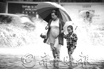 | 9月23日下午,烟台地区普降中雨,气温下降,给人们出行带来不便。图为一位母亲带着孩子穿过满是积水的街道。 李志勇 摄 |