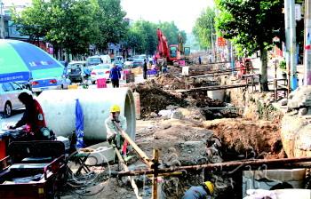 | 化纤厂路上摊贩占道经营严重。 见习记者 郭凯 摄 |  | ▲化纤厂路雨污分流工程施工占去部分路面。