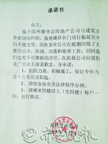 26日上午,长江一路渤海八路十几位市民拉着横幅堵住长江一路,一直到10点钟左右,经过公安、刑警强制取缔横幅,才使得长江一路的交通恢复正常。经了解,这些业主在盛世名门买的房子,且交房时间一拖再拖,延迟一年多仍未交房。经了解,原来是开发商与建筑方不和,导致工期不能按时完成。 这太耽误事 房子住不上房贷照样交 业主李女士告诉记者,2011年她在此小区买的房子,合同上写的是2012年国庆节交房子,但是不知道啥原因,没有按时交房。又说今年9月15日前能拿到房子钥匙,还给业主们每人一份承诺书,但是现在已经9月底了,开发商却还是迟迟未能交房。 “我家孩子今年上小学,本来想去年交了房子,今年孩子就能去五小上学了,但现在房子一直没交,我们就不属于五小这个片区了,今年孩子上学还交了一万八的借读费。”李女士说,她现在外面租着一套房子,每个月还要交房贷2600多元,每个月的房费开支就要3000多元。 王女士则抱怨道,婆婆家、自己娘家东凑西借才有钱买的这房子,现在迟迟不交房,她担心自己这些钱打了水漂。 承诺没兑现 开发商建筑方至今打官司 一位业主交给记者一份2013年7月份高杜置业给他们的承诺书,上面解释道:鉴于滨州聚华益房地产公司与建筑方闹纠纷,致使盛世名门项目拖延至今仍不能交房,承诺表示,保证今年9月15日前交钥匙,滞纳金按有关法律程序办理,储藏室四楼以上(含四楼)每户间,另行购买。 盛世名门项目指挥处负责销售的工作人员告诉记者,主要有两个原因造成至今没交房。首先,现在工程还没有完成,因为7、8月份的连续阴雨天,把当时已经挖好的外围管网工程严重破坏,所以导致工期延后,而且现在正为业主们办理取暖开口手续、天然气开口手续等;其次,则是因为滨州聚华益房地产公司与建筑方闹纠纷,两家至今还在打官司,使得很多程序、手续变得复杂起来。