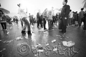 10月1日,两名游客在遍地垃圾的天安门广场上拍照。当天,11万余人在天安门广场及周边观看升旗仪式。升旗仪式结束后,天安门广场留下大片垃圾,最密集处甚至露不出地面。初步估计,清扫的垃圾有5吨左右。 CFP供图