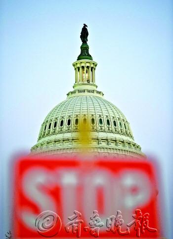 | 9月30日,被“停止”标志遮挡的美国国会大厦。 新华/法新