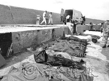 | 10月3日,在意大利兰佩杜萨岛港口,警方和营救人员站在非法移民的尸体旁。 新华/路透