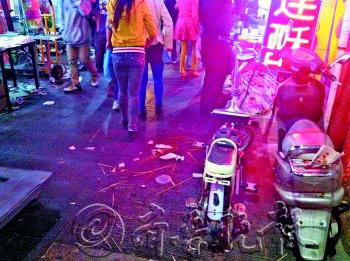 | 2日晚,芙蓉街上竹签遍地。 本报记者 王倩 摄 |
