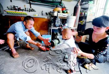 10月3日深夜,济南羊头峪西沟街上,黄小青父子两个还在赶活儿……进入假期以来,很多人出去旅游,铝合金封阳台、不锈钢防盗窗的活儿就比较多,“干我们这行,没活儿就没钱,有活儿就累得要命。”黄小青说。 黄小青名字听起来年轻,其实他已经是五十多岁的人了。祖籍江西南昌安义县的他带领一家五口在济南打工已经有十三个年头了,说起一家五口,其实就是靠黄小青父子挣钱养家。1998年,由于家里遇到旱灾,收成不好的他跟着妹夫来到济南从事铝合金加工。打拼了几年后,黄小青就在羊头峪西沟街开了个小门头店。 “儿子学习不好,跟着他爸爸学这个倒是很有灵气。”黄小青的妻子说。2007年,儿子黄伦飞高中毕业后从老家来到济南跟父亲学手艺,至今六年了,现在他基本上能独立完成大部分活儿。但是在黄小青跟前,黄伦飞话比较少,对父亲的敬畏写在脸上。 黄金周假期已经过去大半了,黄小青父子还没休一天。爷俩干起活儿来说话不多,黄小青一个眼神儿子就能心领神会。看到活儿干漂亮了,黄小青也会高兴地哼唱几句小调。 劳累了一天后,黄小青最高兴的事情莫过于回到租住的小屋,抱抱孙子。一见到孙子,黄小青的脸上就乐开了花,一天的疲惫顿时烟消云散。“这是我一天中最幸福的时光!”
