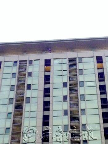 | 女子站在楼顶扬言要跳楼。本报记者 王倩 摄 |