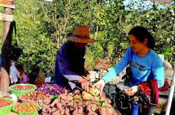 | ▲5日,一游客在临沂蒙山旅游区新景区选购刚出土的紫薯等农产品。