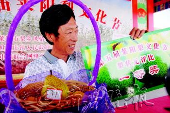一个梨竟然卖了59800元,你相信吗?5日一大早,来自莱阳各地的39位梨农带着精挑细选的100多个莱阳梨,来到莱阳梨的原产地——照旺庄镇西陶漳村,参加“梨状元”评选及拍卖活动。经专家组评定,照旺庄镇后照旺庄村梨农王文朝选送的梨,凭借639.4克的果重、17%的糖分指标和最高的可溶固形物含量脱颖而出,获得2013年莱阳“梨状元”称号。“59800元,第三次!成交!”随着拍卖师一锤定音,“梨状元”以59800元的天价被来自日照的罗先生成功拍得。