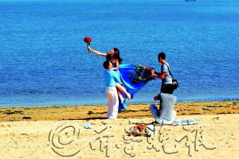 本报10月5日讯(记者 张晶) 每年国庆假期都是新人结婚典礼的集中举办期,今年也不例外。记者从烟台市婚庆产业商会了解到,今年10月2日举办婚礼500场左右,预计6日为假期婚礼举办的又一高潮。 4日上午10点左右,月亮湾附近海岸带已经有4对新人顶着强光在拍婚纱照。负责拍照的婚庆摄影公司工作人员小王介绍,公司一天接七八笔单子,都赶着国庆这个长假拍照片。 拍婚纱照是喜事,结婚典礼更是扎堆办。烟台市婚庆产业商会秘书长农文军介绍,今年10月2日举办婚礼的场次达到500场左右,比10月1日当天的婚礼数还多。“今年的1日只有300场左右,与去年同期相比少了将近200场。”预计6日为假期婚礼举办的又一高潮。 据了解,今年国庆假期婚礼举办场次较多的不是1日而是2日。而往年国庆第一天则是举办婚礼最多的时候。 此外,农文军还提到一个反常现象:“每年4、5、9、10月都是婚庆旺季,其他时间婚庆公司基本处于歇业状态,但是现在这个现象越来越不明显,特别旺的时间没旺起来,特别淡的时间没淡下去。8月份按说也是淡季,但是今年的8月份人还挺多。” 农文军认为,现在结婚的年轻人大部分都在“80”尾、“90”头这个年龄段,这些年轻人受传统习俗的影响越来越小,对日期看得没以前那么重,今天不行可以明天,或者提前一天都可以,还有的新人选择晚上举办婚礼,相比而言灵活多了。人们的结婚消费观念也趋向理智,考虑到结婚成本,并不是非要将婚礼放在婚庆旺季举行。 第一海水浴场沙滩上,一对新人在拍婚纱照。 本报记者 张晶 摄