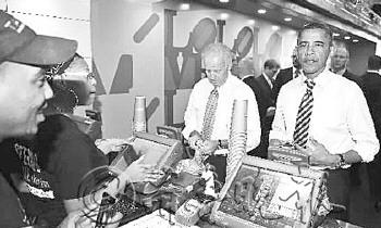 | 当地时间10月3日,美国华盛顿,参议员带着游客们参观国会山庄。这些工作本该由政府职员担任,不过由于政府关门,议员们只好自己来当导游了。 据环球网 |  | 10月4日,美国总统奥巴马与副总统拜登外出购买午餐,总统先生买了一份三明治。有网友调侃,看来白宫内的厨师也都临时休假了。 据北京晚报 |