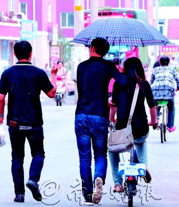 自述:姑娘骑车,小伙儿跑步跟随打伞。