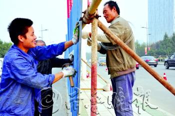 | 施工人员在设置施工围挡。本报记者 公素云 摄 |