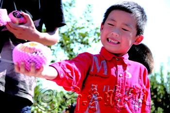 ▼一名小朋友展示自己包装好的苹果。 本报记者 韩逸 摄 |
