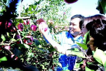 | ▲栖霞市领导陪游客一同体验苹果采摘。 本报记者 赵金阳 摄