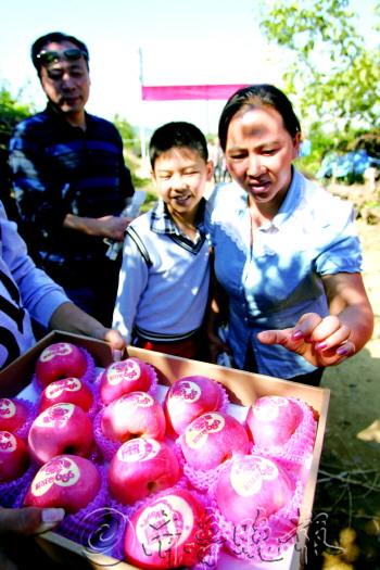 ▼一名小朋友展示自己包装好的苹果。 本报记者 韩逸 摄 |  | ▲栖霞市领导陪游客一同体验苹果采摘。 本报记者 赵金阳 摄