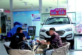 | 9日上午,市区一家4S店内,客户讨论购车事宜。 |