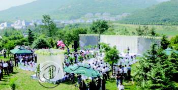 | ◥青山包围中,浪漫的草坪婚礼现场,新人接受亲朋好友的祝福。
