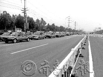 | 加气站前排队等待加气的出租车。 本报记者 张召旭 摄 |