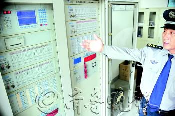 | 10日,在济南华黎花园的消防工作室,小区物业工作人员正在24小时地时刻关注火灾报警控制器。