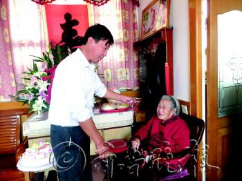 总爱去门口 找乡亲唠嗑 每天早晨6点来钟,张兰芳就自己穿好衣服起床了。她总是先拄着拐杖溜达到大门口,看看门前公路上的风景。等到站得累了,才溜达回屋里躺一会儿,等着7点半吃早饭。 张兰芳在家里躺不住,到傍晚了,老人还要到门口去站站,看看南来北往的车辆和乡亲。老人爱找人说话,时常会和来往的乡亲们聊两句。10日中午,看到有老邻居来祝寿,她的脸上笑开了花。 别看年纪大了,老人一点也不闲着。96岁时还能烧火做饭。最近五六年,重活干不了了,她还是会找些力所能及的事情干。儿女们不让干,她就偷偷找事做,还能洗洗自己简单的衣服。 10月9日,过生日的前一天,趁着家人不注意,老人一手拄着拐棍,一手拿着扫帚,偷偷地把院子打扫了一遍。今年天热的时候,她的手里总拿着苍蝇拍,由于动作比较慢,苍蝇们往往能从她手底下逃生,为了打一只苍蝇,她有时候会追到厕所去。 10日中午12点,院子外面响起了祝寿的鞭炮声,老人侧耳听了听,转头提醒家人说“别浪费啊”。 一天三顿饭 每顿一碗稀饭 除了耳朵有点聋外,张兰芳的身体没一点儿毛病。老人从来没有因为生病进过医院,以前感冒时也不吃药,过两三天后就好了。 老人的饭量很稳定,每顿都差不多的量:早晨喝碗稀饭,吃半块馒头、一个鸡蛋;午饭和晚饭则少了鸡蛋,多了炒菜。她顿顿必喝大米、豆子等五谷煮的稀饭。 不管饭菜好坏,老人从来不挑食,不过她也有自己喜欢和讨厌的食物——不爱吃鸡肉、猪头肉,喜欢吃排骨和丸子。 老人不抽烟、不喝酒、不喝茶,没有什么特别的喜好。“如果硬要挑一个爱好的话,那就是爱干活,总也闲不住。”儿媳陈瑞兰笑着说。 80岁以上老人 村里有30多位 老人有2女1子,43岁时老来得子,如今五世同堂。儿媳嫁进家门33年,一直和老人住一块,偶有磕磕碰碰,但是婆媳两人从没吵过架。 莱州市金城镇城后万家村有140户,420多人,其中80岁以上的老人有30多位,快要占到十分之一了。城后万家村还有一位95岁的老人,身体很壮实。 除了民政部门和人社部门的福利待遇外,每年过年时,城后万家村也要给老人们发福利:60岁-70岁的老人发150元;70岁-80岁的发200元;80岁以上的发300元;百岁以上的特别奖励2000元。 “儿女孝顺村风好,老人们才能长寿。”城后万家村村委书记万继远说,长寿与否和经济水平不挂钩,现在大家都能吃上饭,饿不着冻不着,想让老人长寿,儿女们不用老给钱,不用老给好吃的,而是要常陪在老人身边,孝顺老人。
