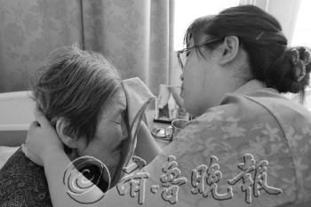 | 边盼盼为老人擦脸,并用言语鼓励老人。 本报记者 姜文洁 摄 |