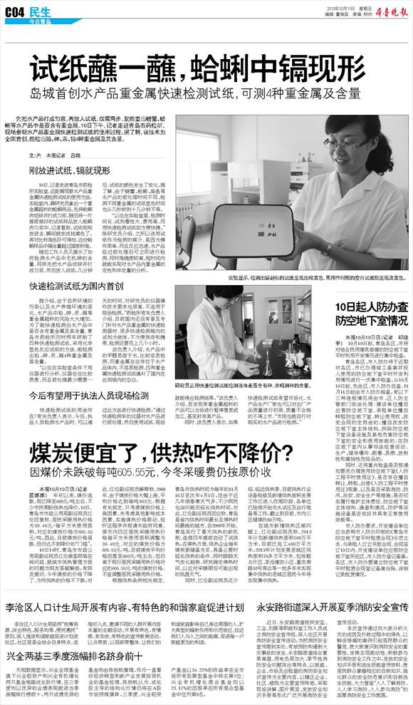 岛城首创水产品重金属快速检测试纸,可测4种重金属及含量