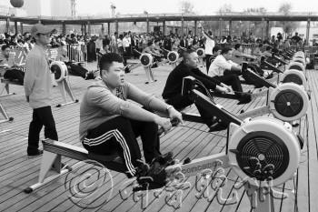 | 13日上午,在现场市民积极参与划船器比赛。 本报记者 王小会 摄 |
